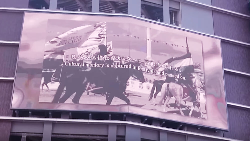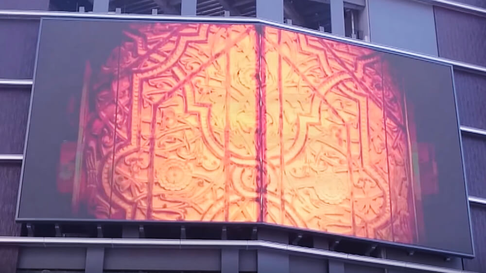 こちらに見られるLEDビジョンは、建物の形に合わせ中心部分が少し尖ったように設置されています。