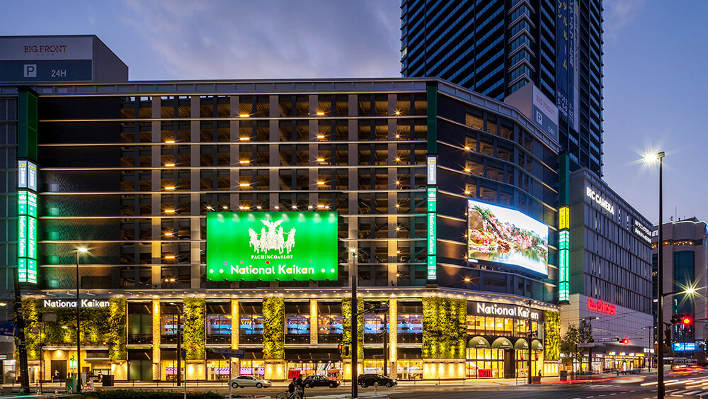 今回は、広島県最大級のパチンコ店「ナショナル会館」に導入されているLEDビジョンをご紹介いたします。