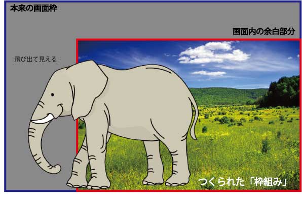 映像は、画面を目一杯使用せず、端にあえて余白をつくることで、視聴している人に対して画面の「枠組み」を意識させます。この意図して画面の中につくられた「枠組み」をイラストが飛び出すことで、実際に画面から映像が飛び出しているように錯覚させることができるのです。