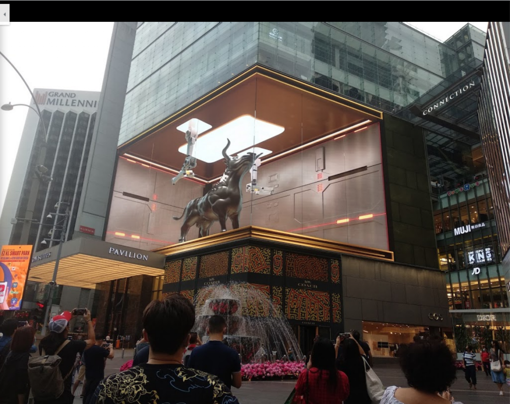 マレーシアの首都クアラルンプールにあるセレブ御用達のショッピングモール「パピリオン クアラルンプール」の壁面にも3Dコンテンツを放映するLEDビジョンが設置されています。このLEDビジョンは横60.8m × 縦21.5mの総面積1,310㎡の巨大LEDビジョンもまた湾曲した形をしています。