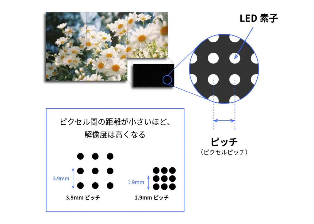 LEDモジュールパネルは、LED素子のピクセルピッチによって見え方が変化します。ピクセルピッチはLED素子間の距離です。ピクセルピッチが小さいと鮮明な表示になり、ピクセルピッチが大きいとぼやけた表示になる傾向です。