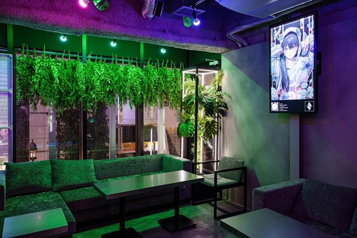 デジタルサイネージが、人の姿を描いたデジタルアートを魅力的に映し出しており、鑑賞しながらシーシャを楽しめる空間となっています。
