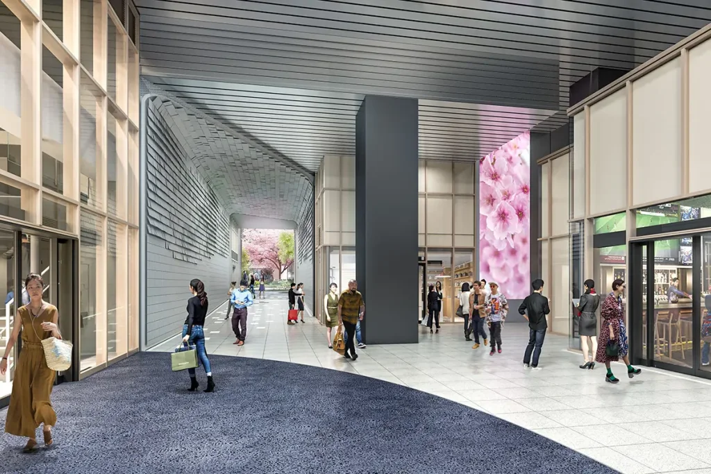 渋谷サクラステージの「ときめきSTAGE」は、JR側からの来街者を温かく迎えるエントランスホールに位置し、美しく躍動感あふれる空間を提供しています。このスペースの特長として、桜丘らしいモザイク状の格子状エレメントと、存在感を持つ巨大なデジタルサイネージが挙げられます。