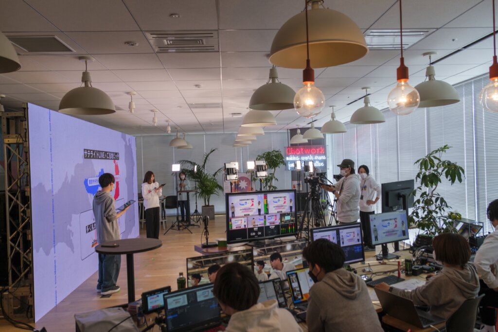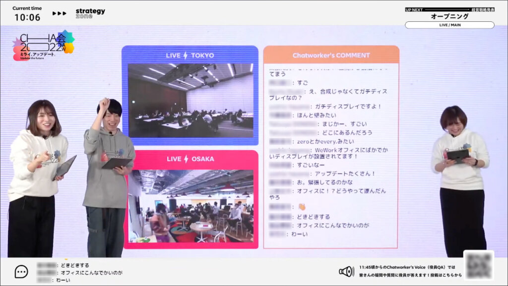 以前はオフラインで開催していたのですが、コロナ禍で社員数の増加などもあり、以前のように全員で集まっての開催が難しくなり、オンラインとオフラインのハイブリット化を進めています。今回の「Cha会2022AW」もオンラインとオフラインのハイブリッドで開催し、拠点となる東京オフィスから配信し、自宅での視聴、東京と大阪に設置するサテライト会場でのパブリックビューイングを選べるようにしました。