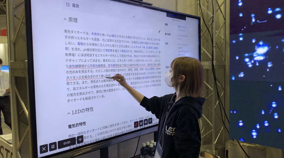 当日のブースには、大型LEDビジョン、液晶モニターはもちろん、CUBE型や1.25mmピッチのGOBパネル、顔認証機能つきアルコール検知器「KAIORO+」、インタラクティブホワイトボードを展示しました。