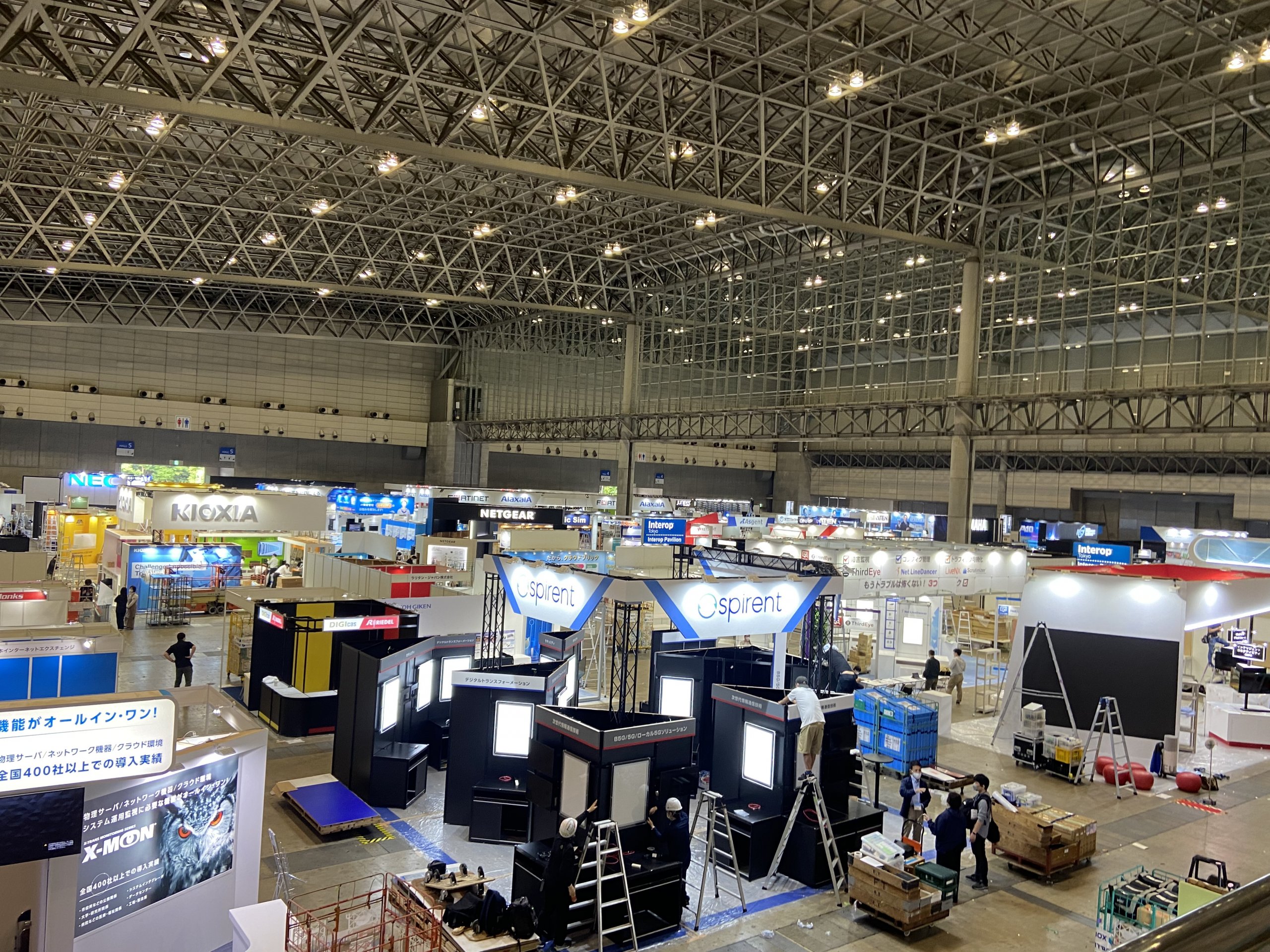 今回は2コマのブースに出展いたしました。設置方法はトラスの上部に液晶モニターを設置し、奥にはLEDビジョンを吊るしました。