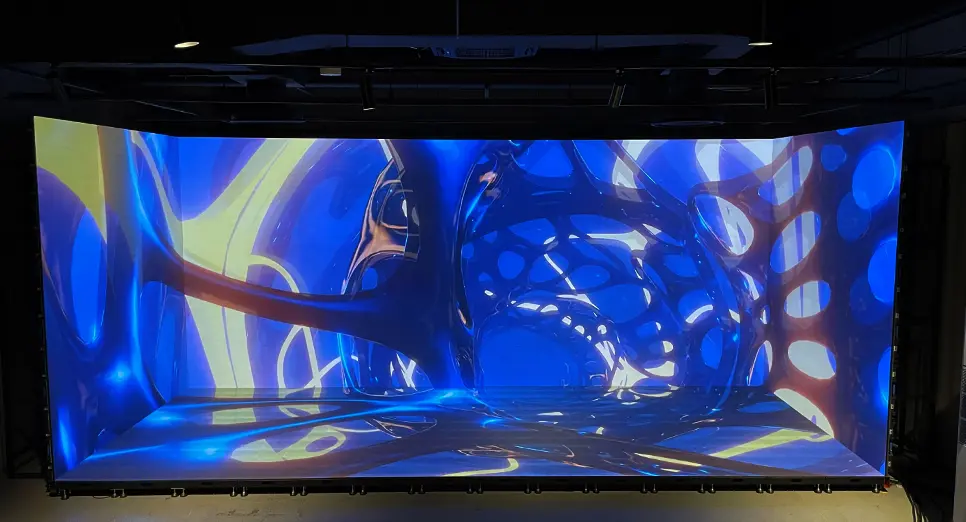 正面に300インチの大型LEDビジョンと、左右下の3方向から囲う4面1体型のLEDビジョンが常設されている撮影スタジオです。LEDビジョンに特化したLED TOKYOだからこそ出来る、没入感のある映像演出が可能です。