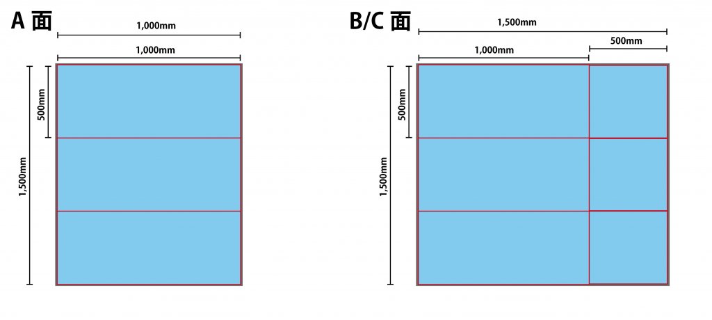 今回はA面にW1,000×W500mmの筐体を3枚使用し、W1,000×H1,500mmの面を作り上げました。B・C面はそれぞれW1,000×H500mmの筐体を3枚、W500×H500mmの筐体を3枚組み合わせてW1,500×H1,500mmの一面を作り上げました。