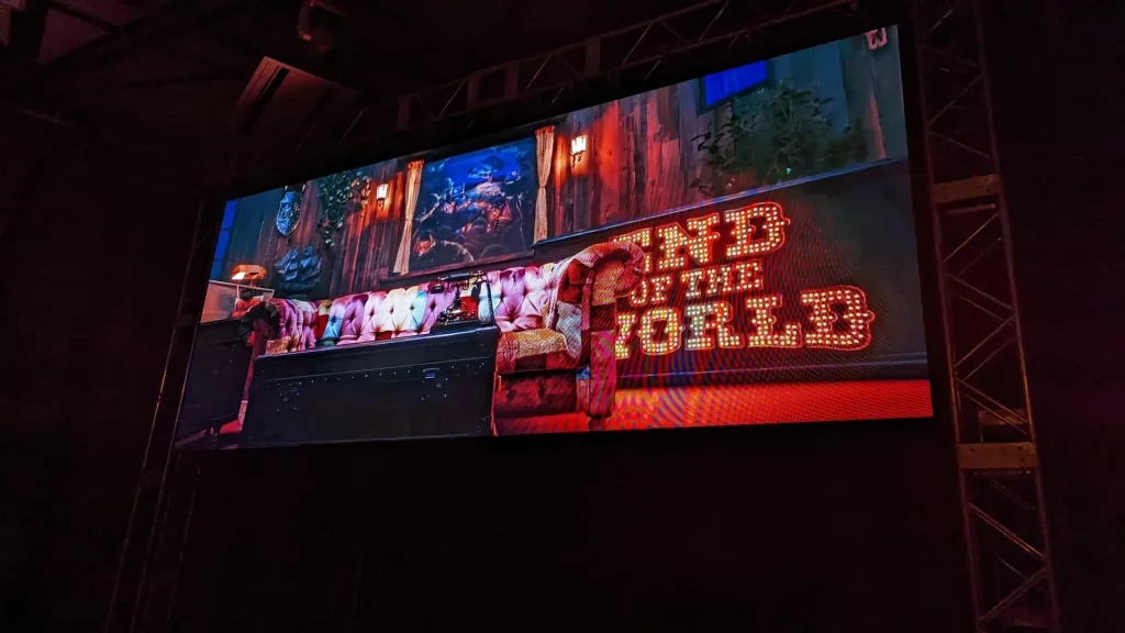 「THE SECRET HOUSE」では、巨大なLEDビジョンと実物セットを組み合わせることで空間演出を行っていました。LEDビジョンはサイズやレイアウトが自由です。パネルを接続して巨大な画面を構築できるほか折り曲げることもできます。天井からつるしたり、絵画のように壁に貼り付けたりするなどして、さまざまな空間演出が可能です。