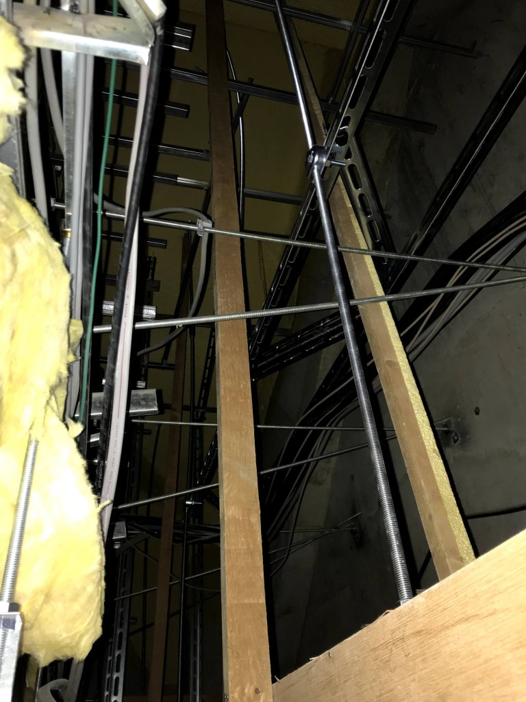 そのため弊社としては初の試みとなる設置場所の天井裏に櫓を組み、天井から吊り下げるように設置。下にはアジャスターを支えとしています。