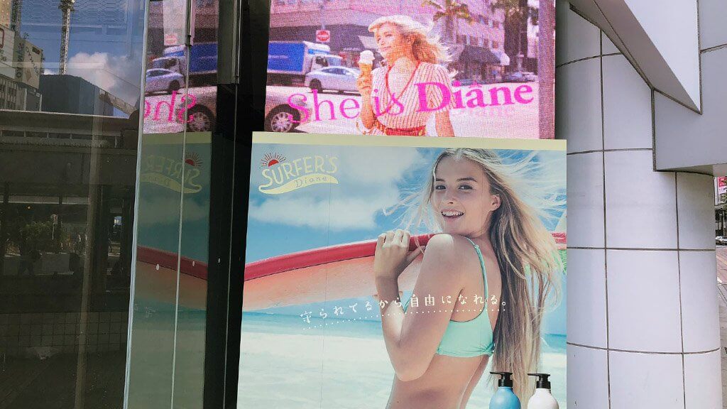 大きなポスターパネルと、LEDビジョンの映像を使ったコラボレーション広告になっています。